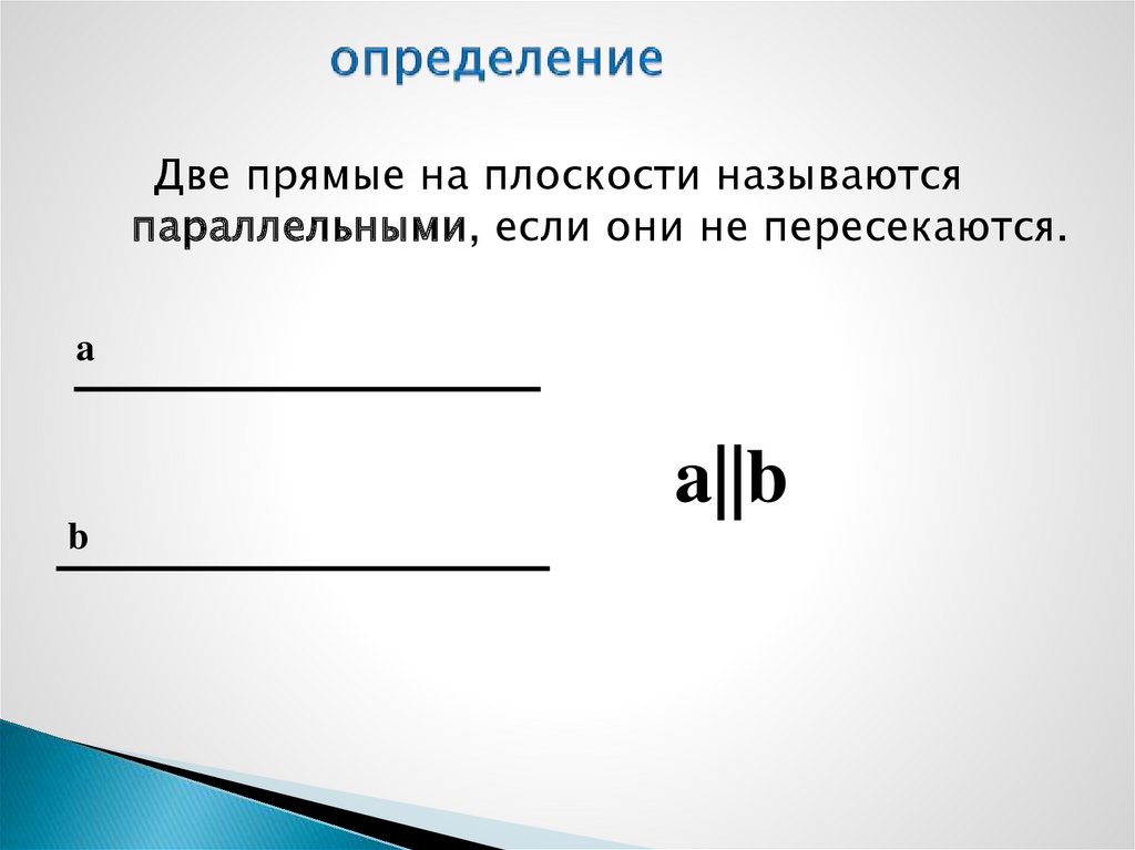 Две прямые на плоскости называютсяпараллельными, если они не пересекаются.