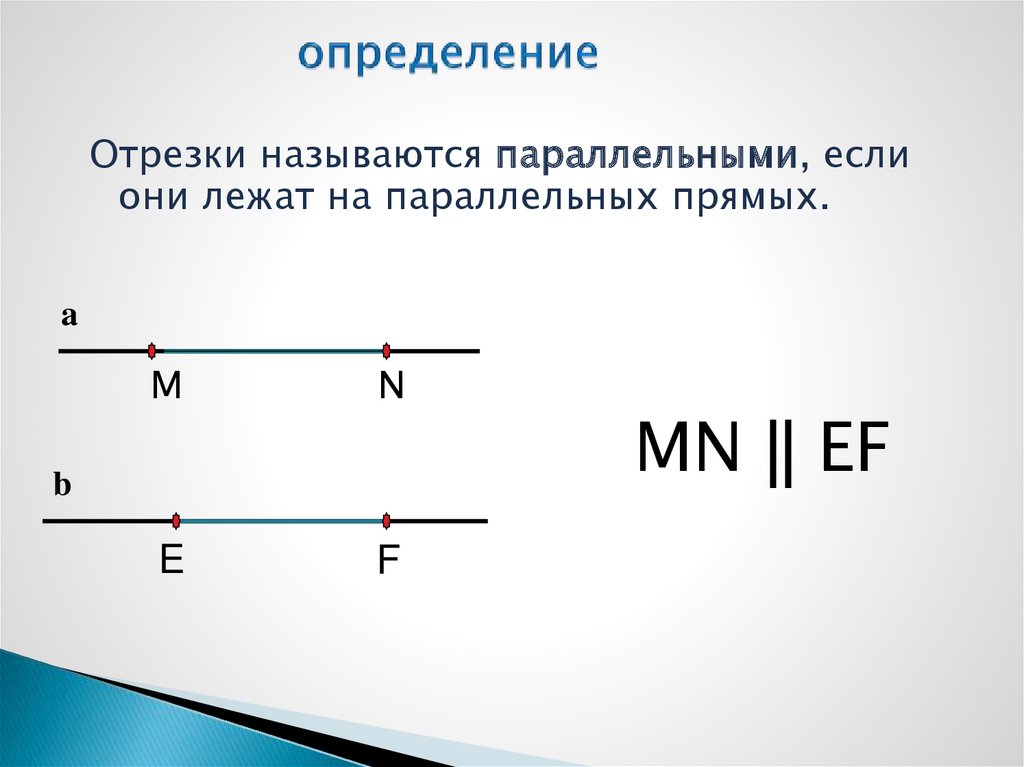 Отрезки называются параллельными, еслиони лежат на параллельных прямых.