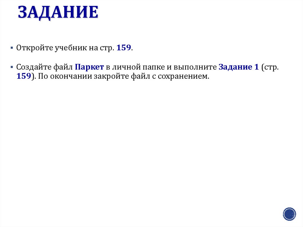 Создайте файл Паркет в личной папке и выполните Задание 1 (стр.