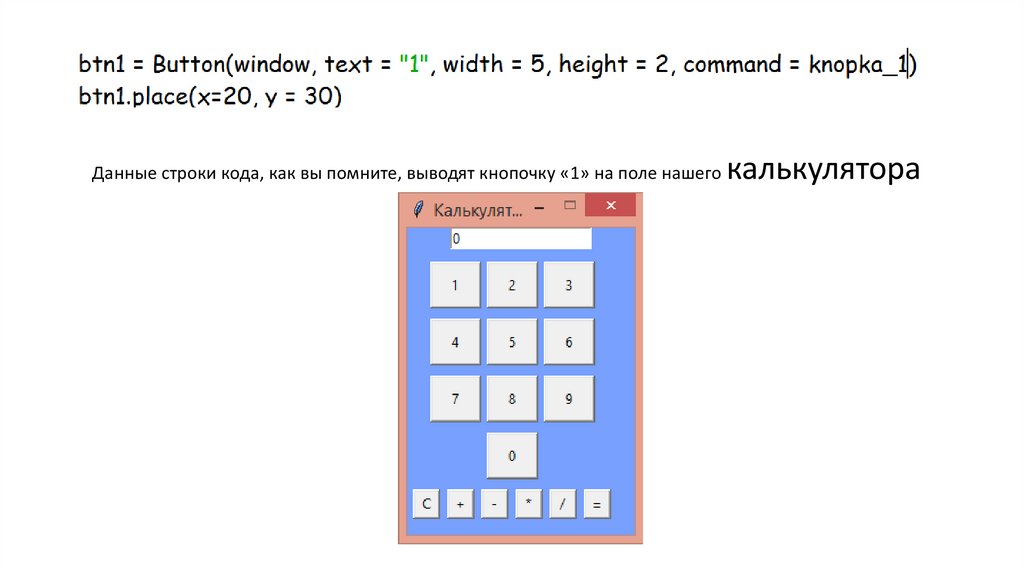 Данные строки кода, как вы помните, выводят кнопочку «1» на поле нашегокалькулятора