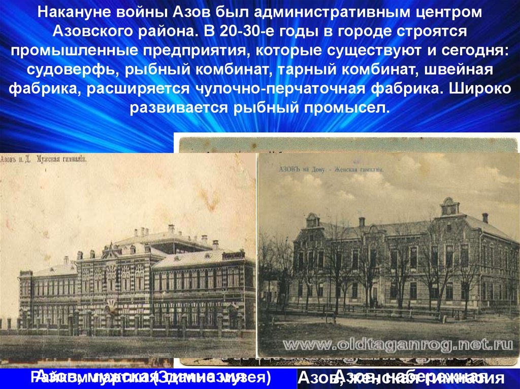 Накануне войны Азов был административным центромАзовского района. В 20-30-е годы в городе строятся