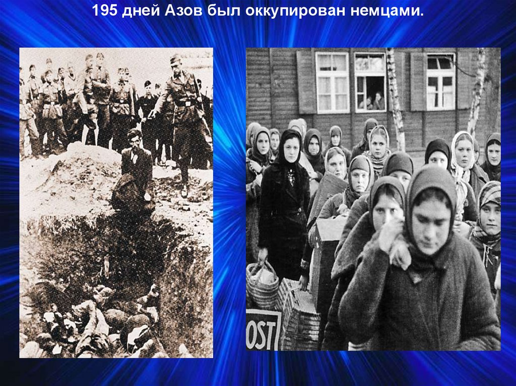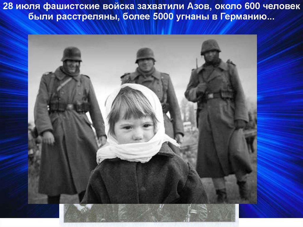 28 июля фашистские войска захватили Азов, около 600 человекбыли расстреляны, более 5000 угнаны в Германию...