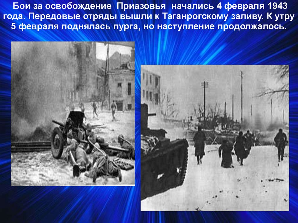 Бои за освобождение Приазовья начались 4 февраля 1943года. Передовые отряды вышли к Таганрогскому заливу. К утру