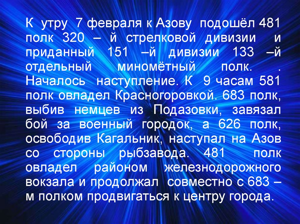 К утру 7 февраля к Азову подошёл 481полк 320 – й стрелковой дивизии и