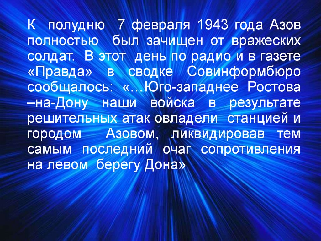 К полудню 7 февраля 1943 года Азовполностью был зачищен от вражеских
