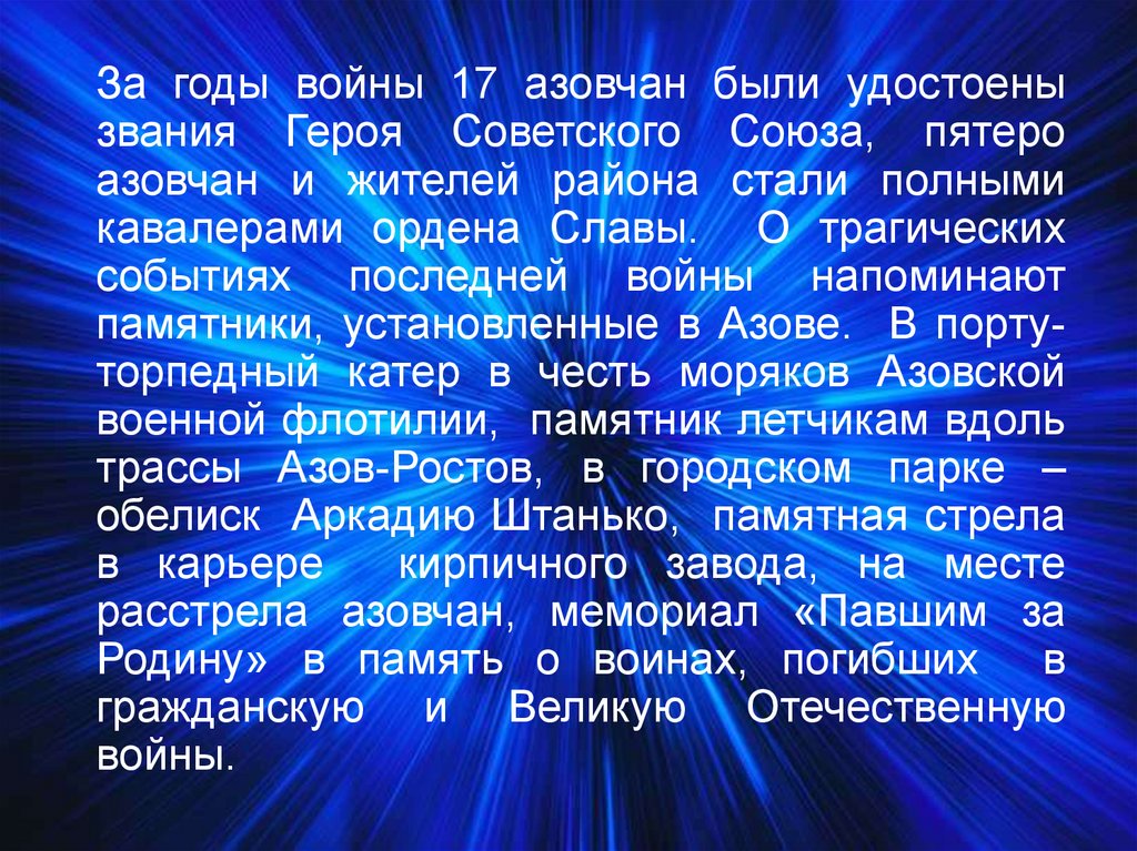 За годы войны 17 азовчан были удостоенызвания Героя Советского Союза, пятеро
