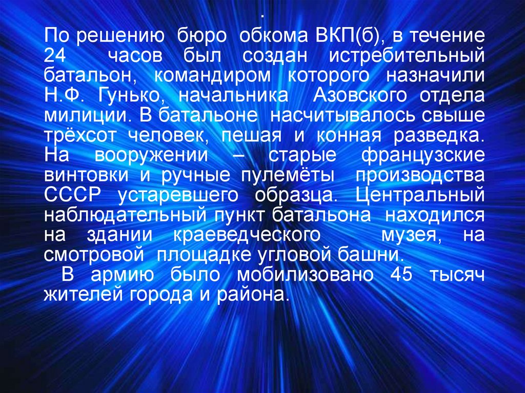 17 октября 1941 года противник захватил Таганрог. Азов сталприфронтовым городом. Началась мобилизация. В здании