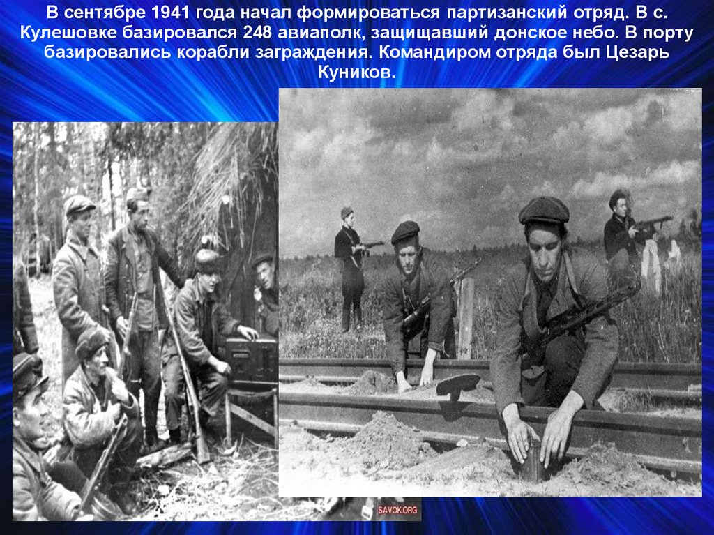 В сентябре 1941 года начал формироваться партизанский отряд. В с.Кулешовке базировался 248 авиаполк, защищавший донское небо. В порту