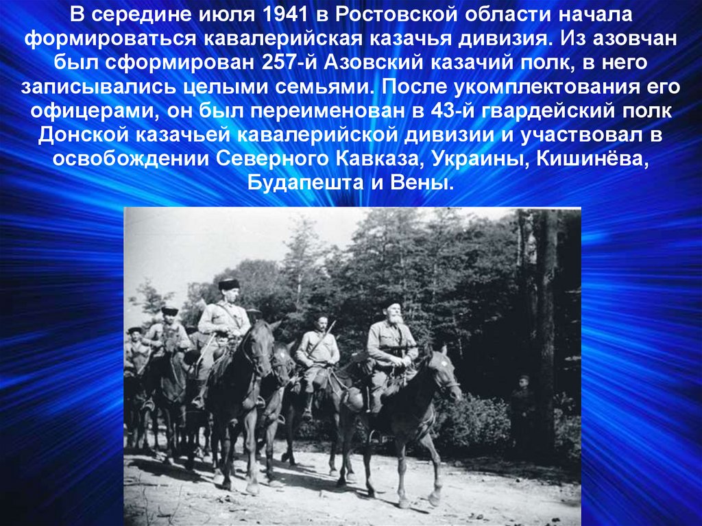 В середине июля 1941 в Ростовской области началаформироваться кавалерийская казачья дивизия. Из азовчан