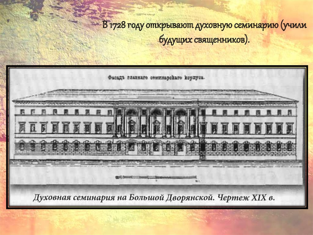 В 1728 году открывают духовную семинарию (училибудущих священников).