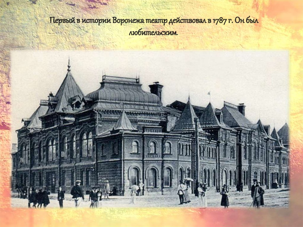 Первый в истории Воронежа театр действовал в 1787 г. Он быллюбительским.