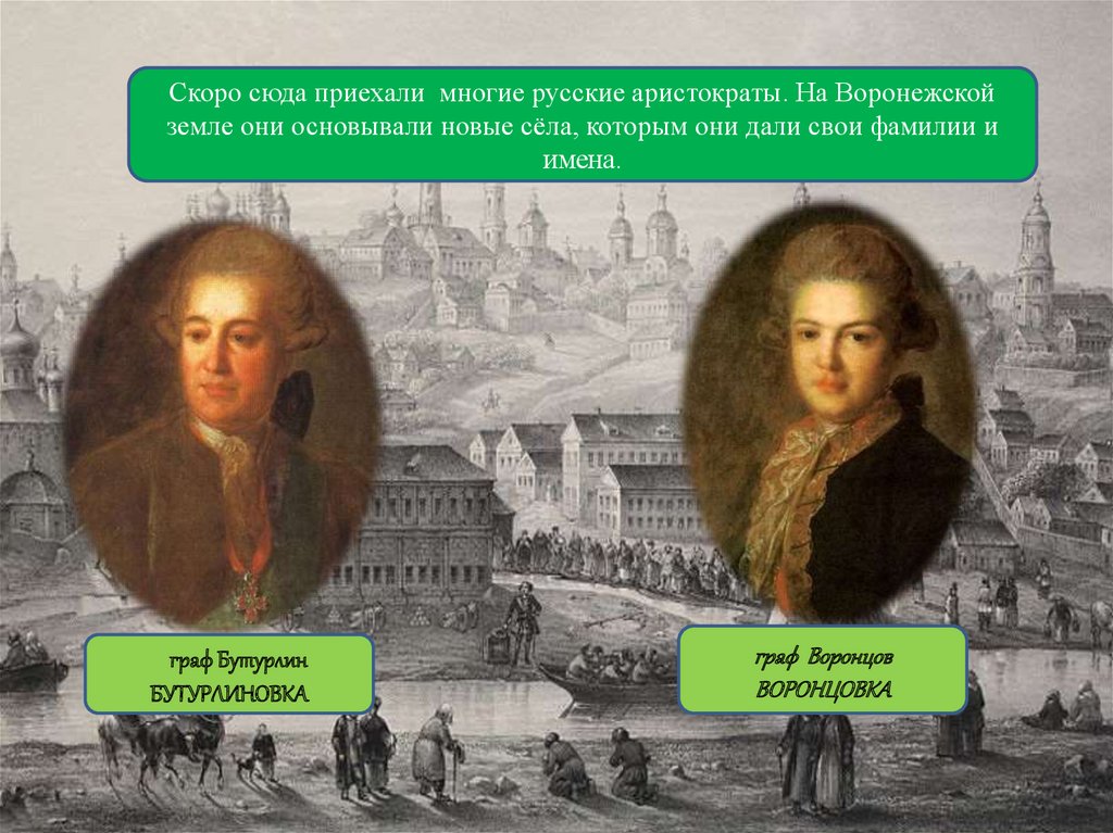 Скоро сюда приехали многие русские аристократы. На Воронежскойземле они основывали новые сёла, которым они дали свои фамилии и