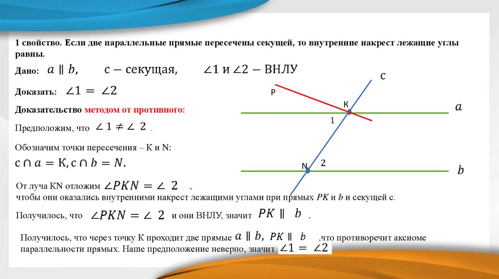 1 свойство. Если две параллельные прямые пересечены секущей, то внутренние накрест лежащие углыравны.