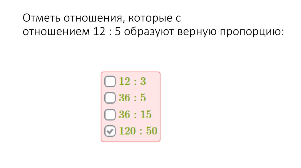 Отметь отношения, которые сотношением 12 : 5 образуют верную пропорцию: