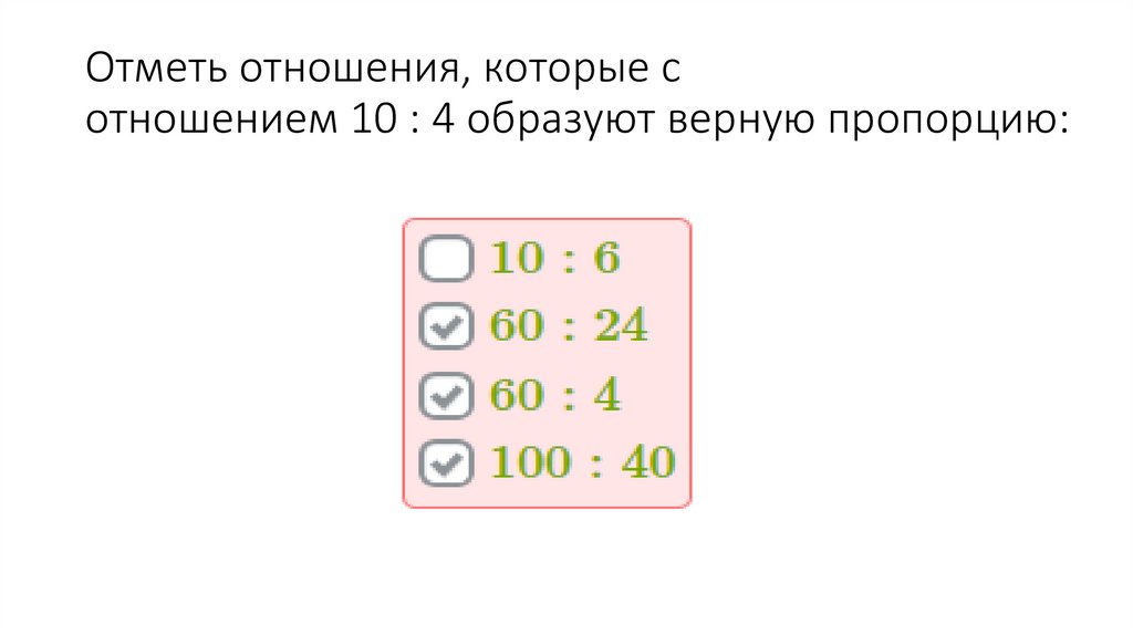Отметь отношения, которые сотношением 10 : 4 образуют верную пропорцию: