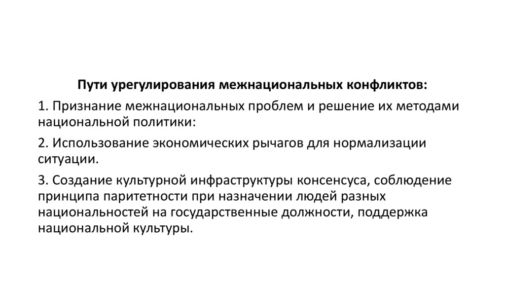 Пути урегулирования межнациональных конфликтов:1. Признание межнациональных проблем и решение их методами