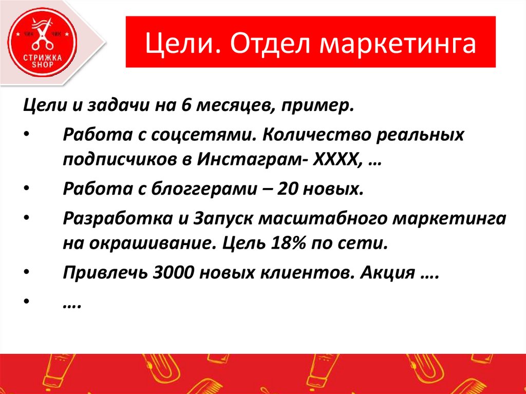Цели. Отдел маркетингаЦели и задачи на 6 месяцев, пример.