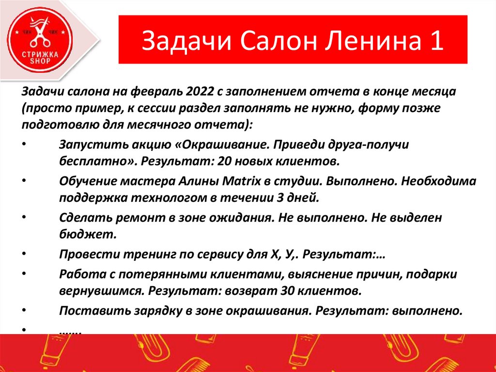 Задачи Салон Ленина 1Задачи салона на февраль 2022 с заполнением отчета в конце месяца