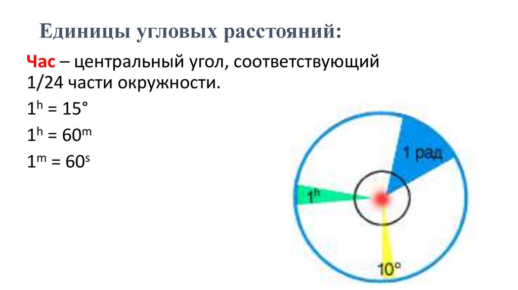 Единицы угловых расстояний:Час – центральный угол, соответствующий
