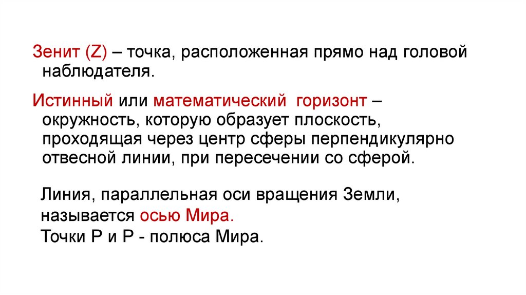 Зенит (Z) – точка, расположенная прямо над головойнаблюдателя.