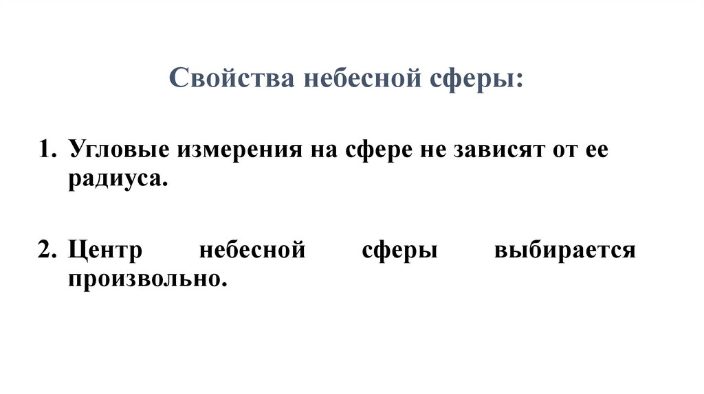 Свойства небесной сферы:1. Угловые измерения на сфере не зависят от ее