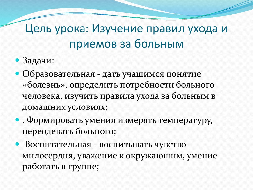 Цель урока: Изучение правил ухода иприемов за больным