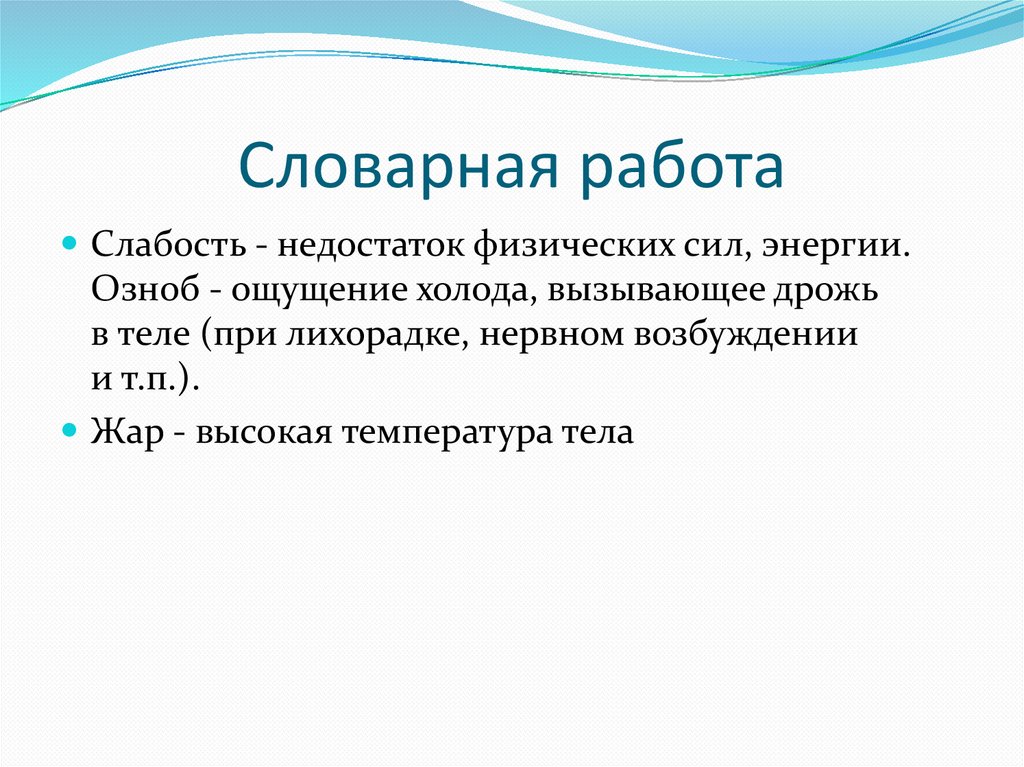 Словарная работаСлабость - недостаток физических сил, энергии.