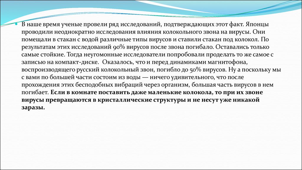 В наше время ученые провели ряд исследований, подтверждающих этот факт. Японцыпроводили неоднократно исследования влияния колокольного звона на вирусы. Они