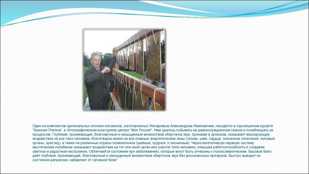 Один из комплектов оригинальных плоских колоколов, изготовленных Жихаревым Александром Ивановичем, находится в горнолыжном курорте"Красная Поляна", в Этнографическом культурном центре "Моя Россия". Нам удалось побывать на демонстрационном сеансе и понаблюдать за