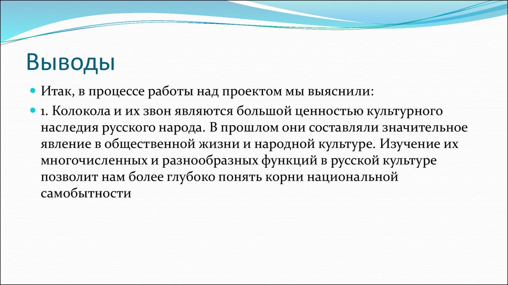 Итак, в процессе работы над проектом мы выяснили:1. Колокола и их звон являются большой ценностью культурного