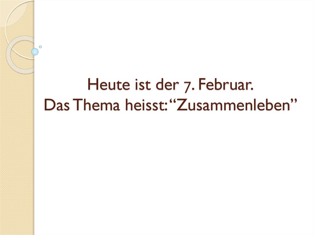 Heute ist der 7. Februar.Das Thema heisst: “Zusammenleben”