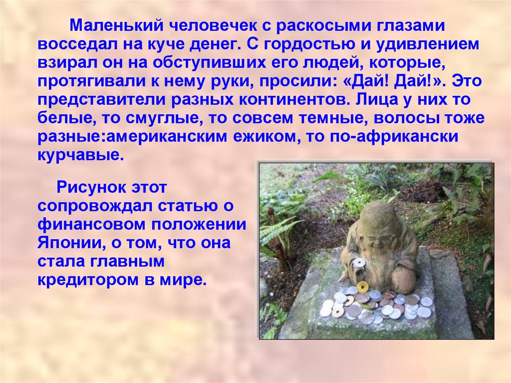 Маленький человечек с раскосыми глазамивосседал на куче денег. С гордостью и удивлением