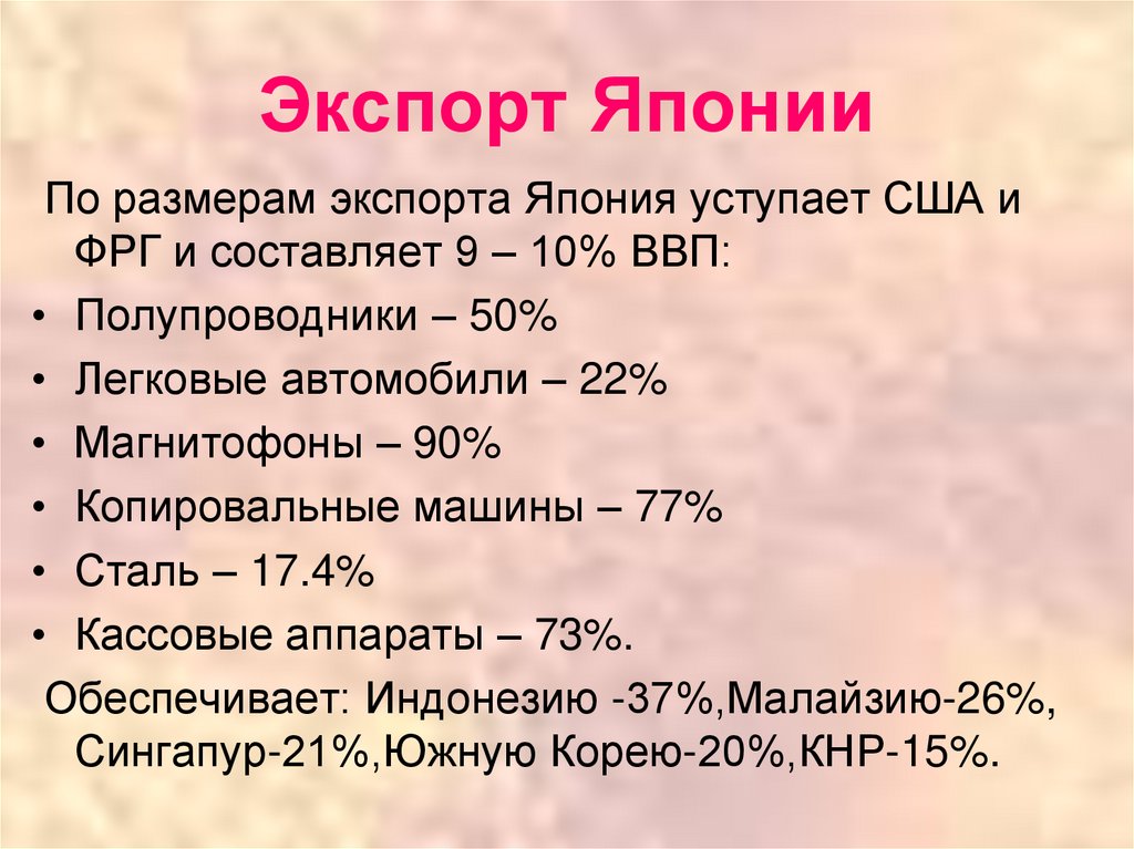 Экспорт ЯпонииПо размерам экспорта Япония уступает США и
