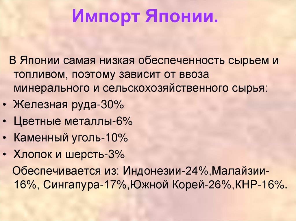 Импорт Японии.В Японии самая низкая обеспеченность сырьем и