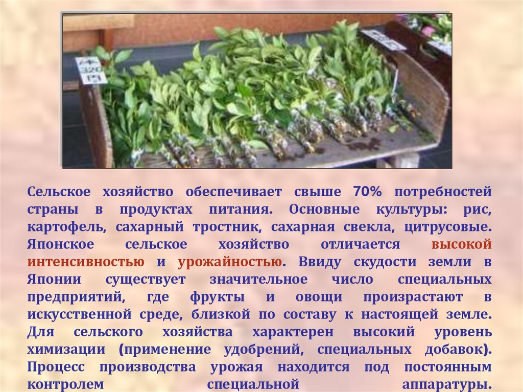 Сельское хозяйство обеспечивает свыше 70% потребностейстраны в продуктах питания. Основные культуры: рис,