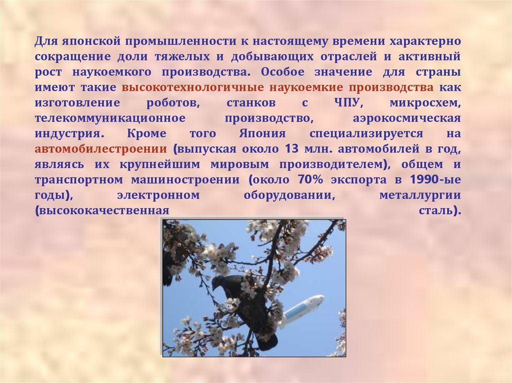 Для японской промышленности к настоящему времени характерносокращение доли тяжелых и добывающих отраслей и активный
