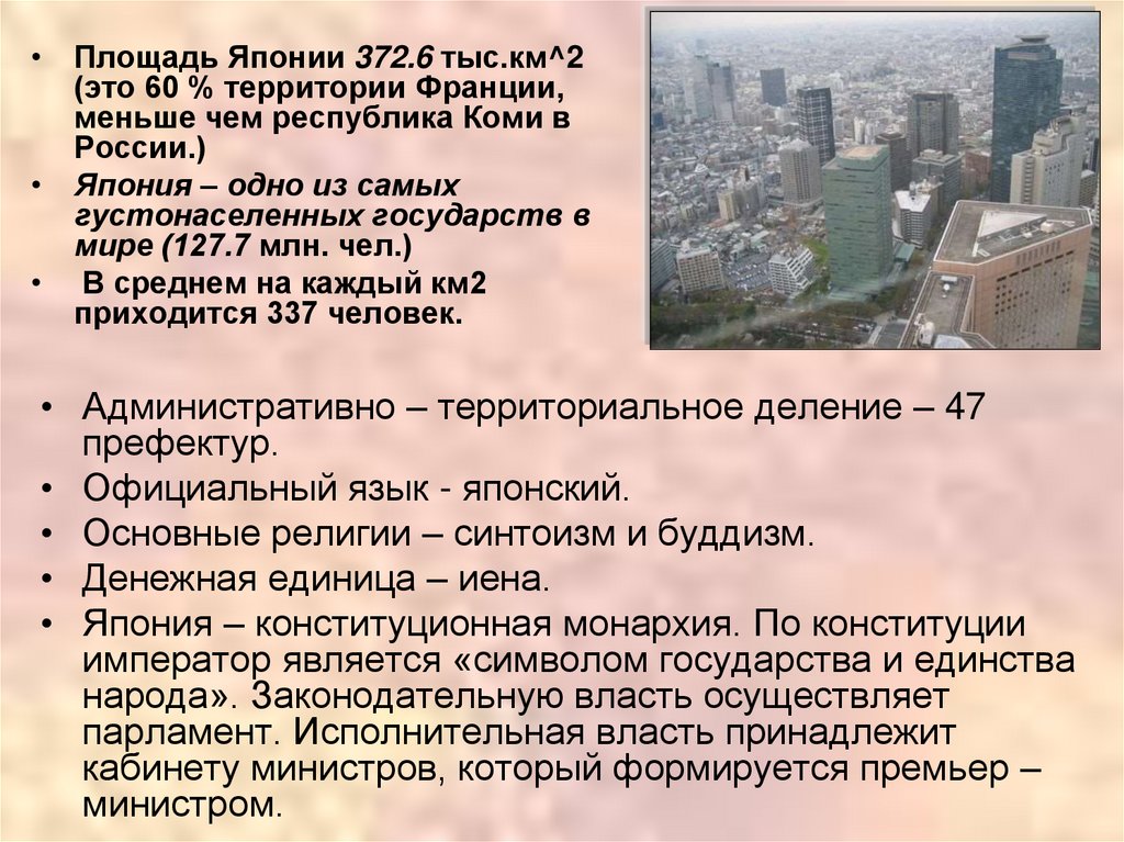 • Площадь Японии 372.6 тыс.км^2(это 60 % территории Франции,