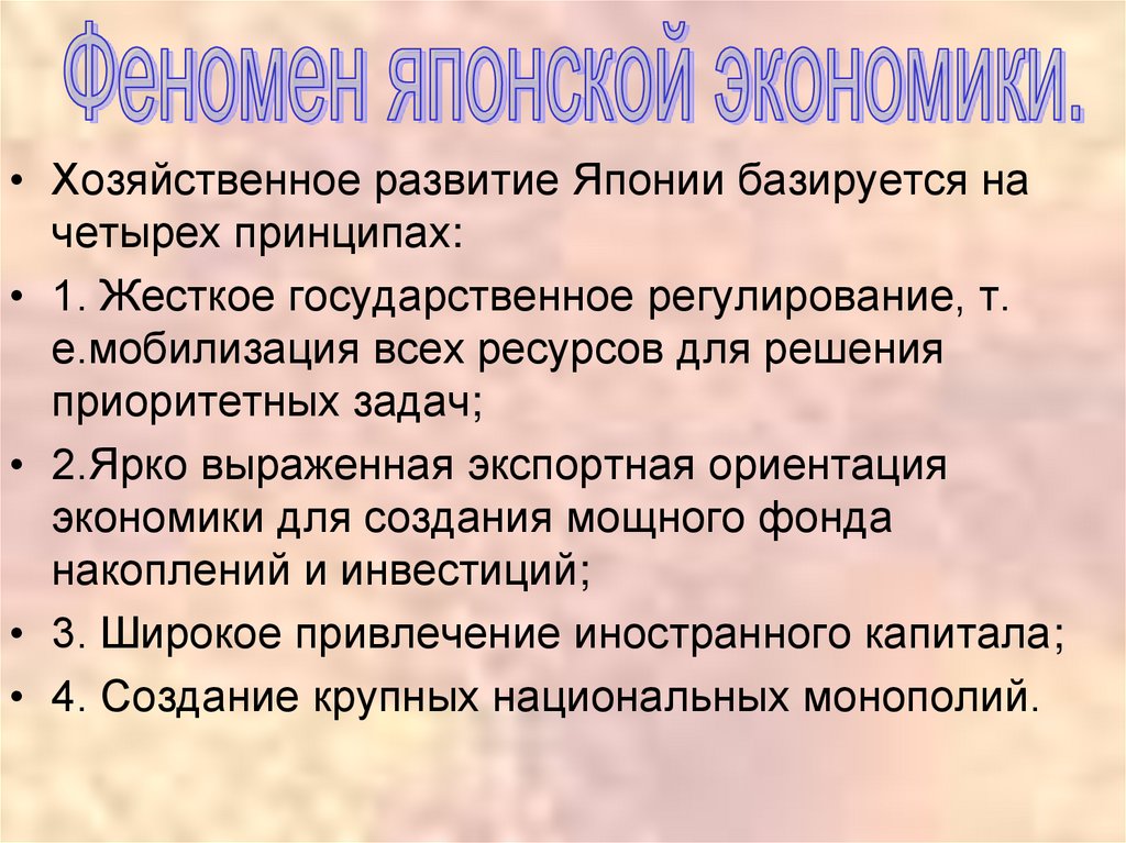 • Хозяйственное развитие Японии базируется начетырех принципах: