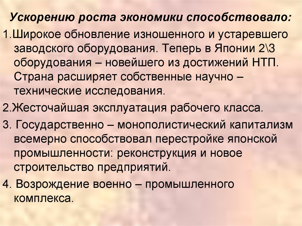 Ускорению роста экономики способствовало:1.Широкое обновление изношенного и устаревшего