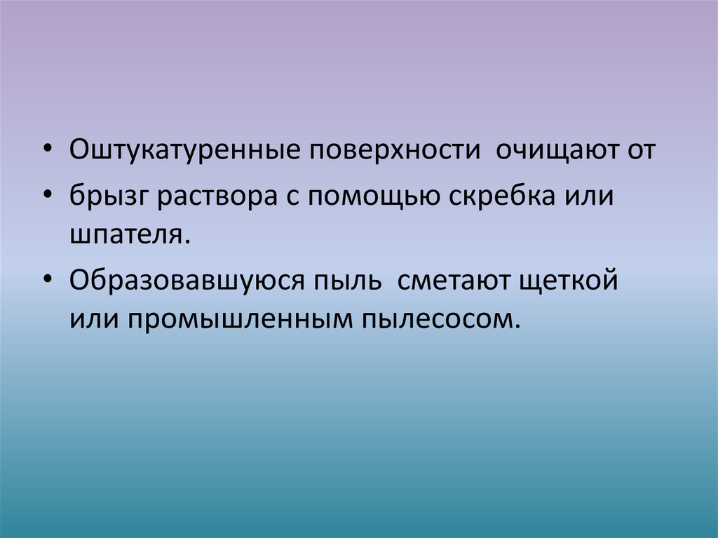 • Оштукатуренные поверхности очищают от• брызг раствора с помощью скребка или