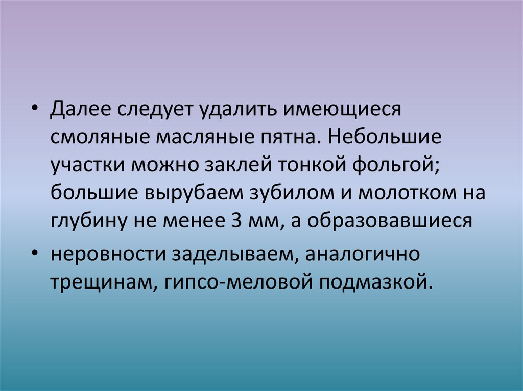 • Далее следует удалить имеющиесясмоляные масляные пятна. Небольшие
