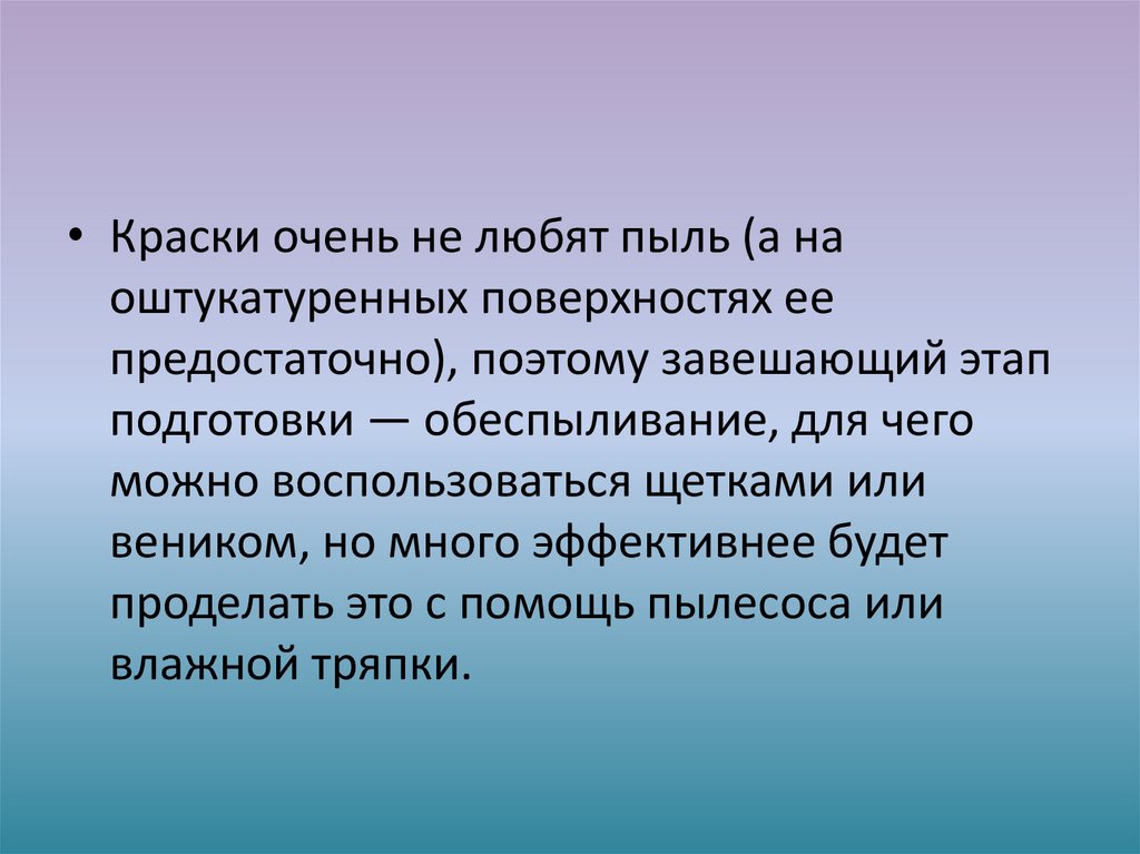 • Краски очень не любят пыль (а наоштукатуренных поверхностях ее