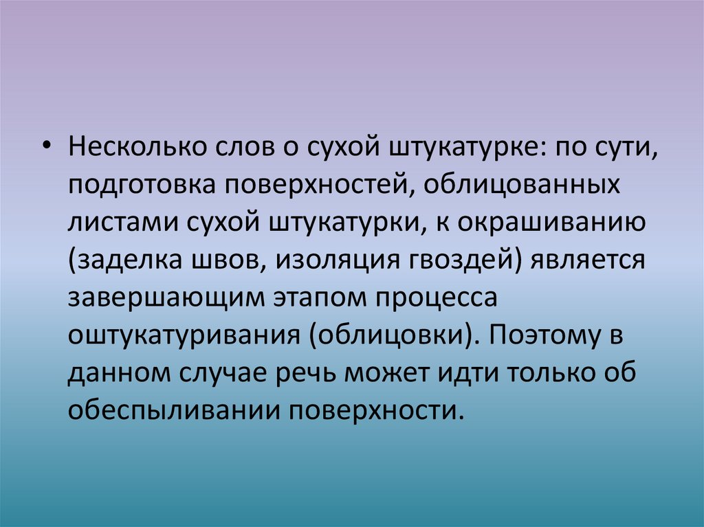 • Несколько слов о сухой штукатурке: по сути,подготовка поверхностей, облицованных