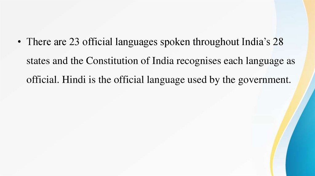 • There are 23 official languages spoken throughout India’s 28states and the Constitution of India recognises each language as