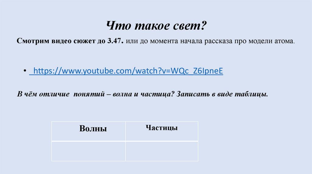 Что такое свет?Смотрим видео сюжет до 3.47. или до момента начала рассказа про модели атома.