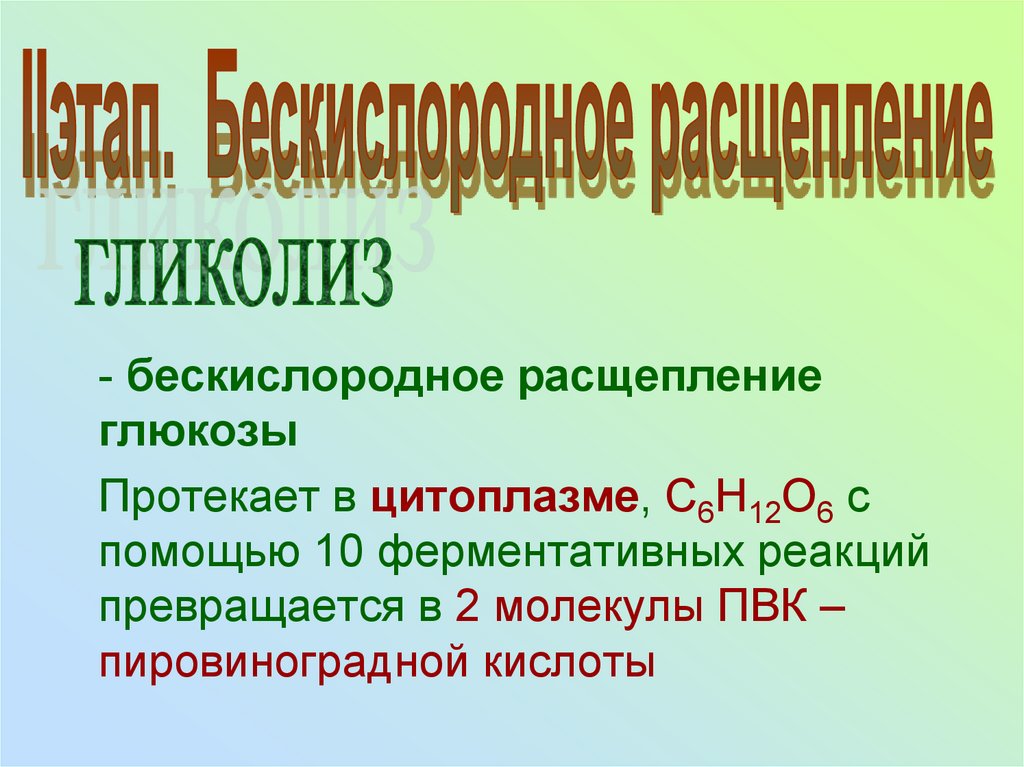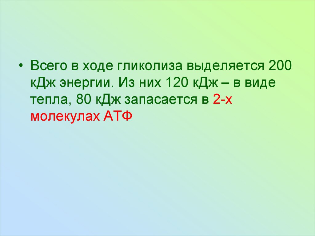 • Всего в ходе гликолиза выделяется 200кДж энергии. Из них 120 кДж – в виде