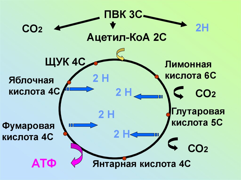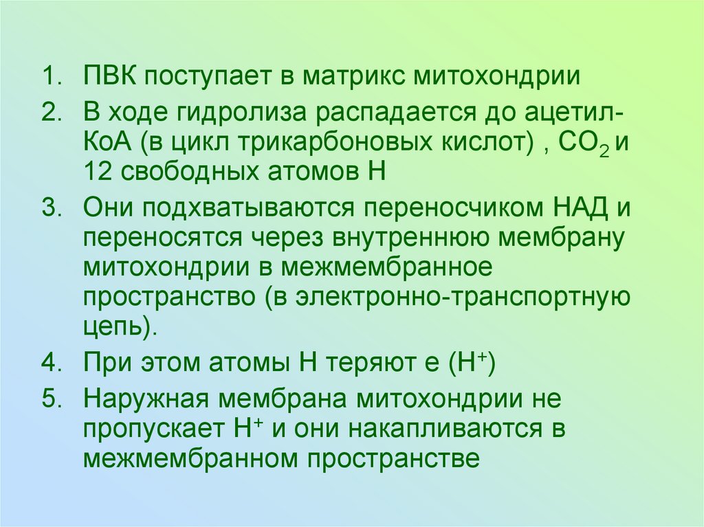 1. ПВК поступает в матрикс митохондрии2. В ходе гидролиза распадается до ацетилКоА (в цикл трикарбоновых кислот) , СО2 и