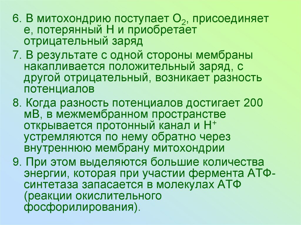 6. В митохондрию поступает О2, присоединяете, потерянный Н и приобретает