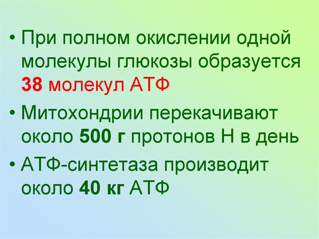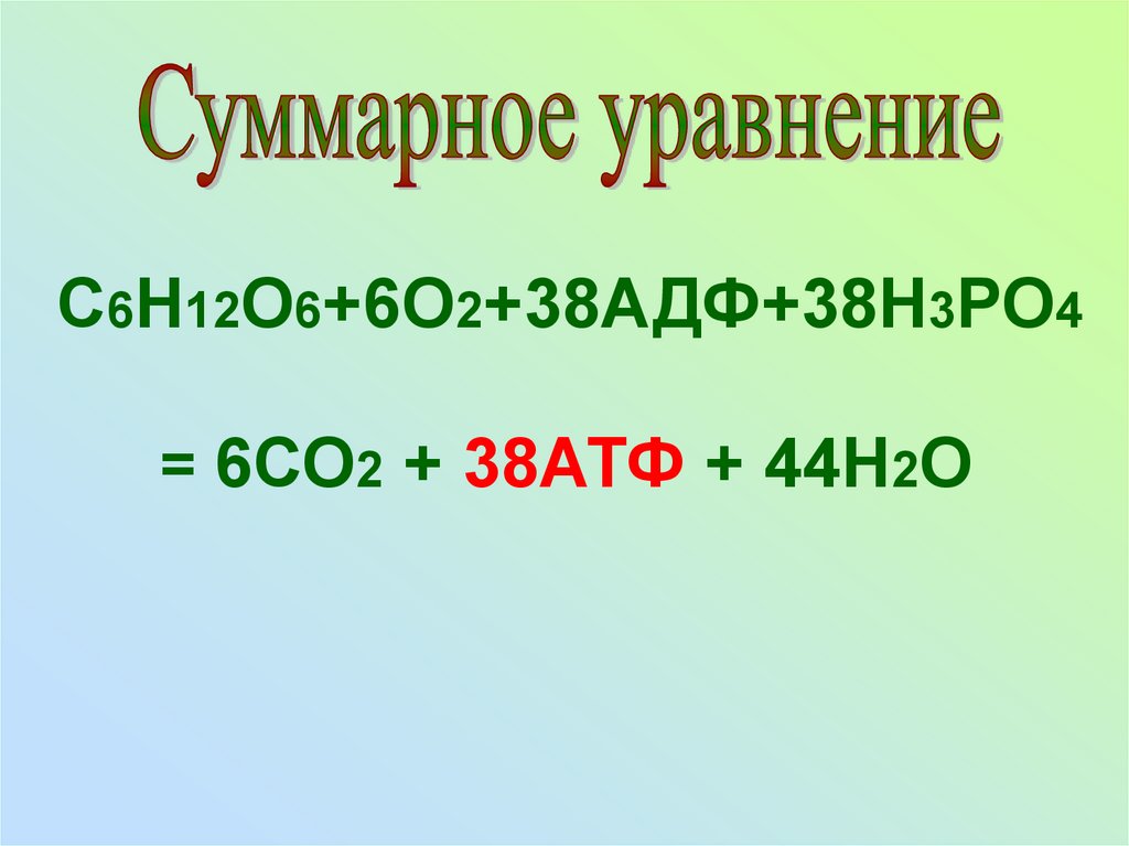 С6Н12О6+6О2+38АДФ+38Н3РО4= 6СО2 + 38АТФ + 44Н2О
