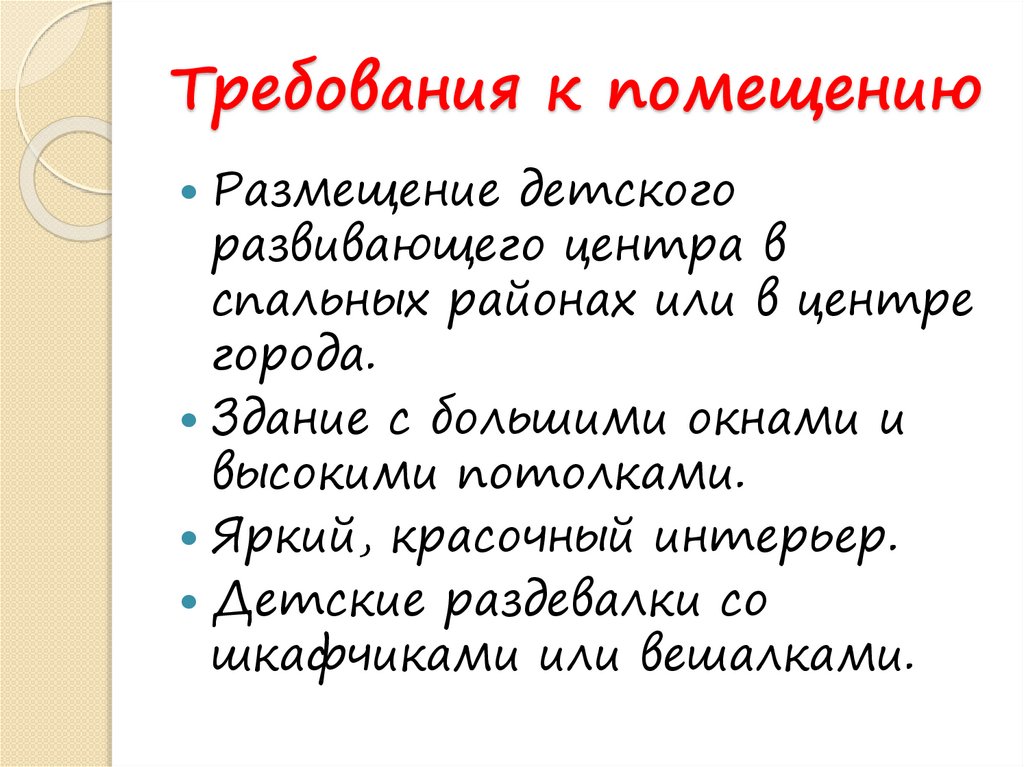 Требования к помещениюРазмещение детского